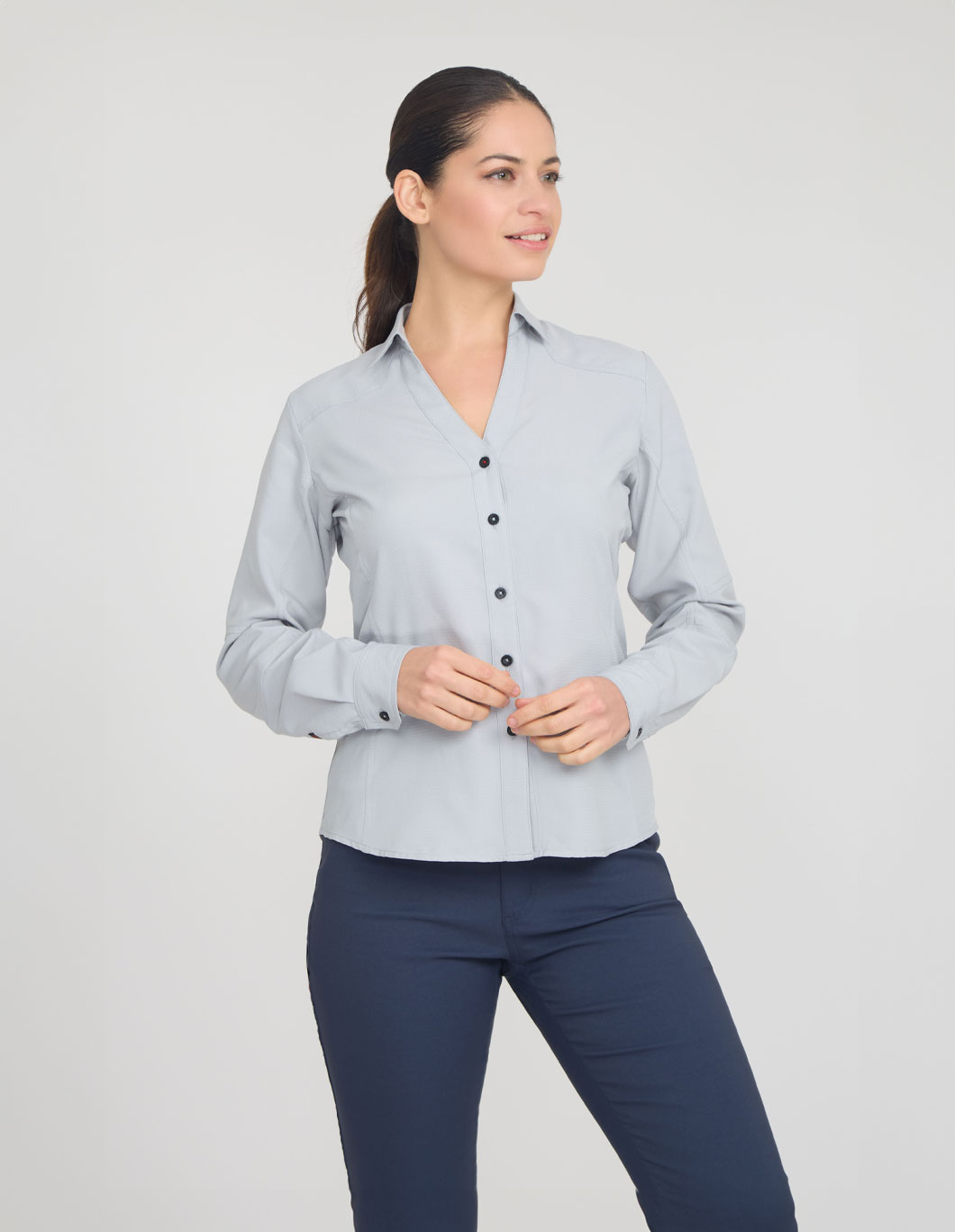 Rango de tallas: XS, S, M, L, XL, XXL. • Tela anti ácida, elastizada y anti desgarro. • Corte ergonómico, diseño y calce slim. • Máxima frescura y protección. • Textil avanzado extremadamente liviano. • Diseño que realza la figura. • Costuras reforzadas dobles y remates en zonas de mayor exigencia. • Protección UPF 50+. Tela principal: 100% Políester Abletex® DYNAMIC® – Colores: Grey – Light Beige